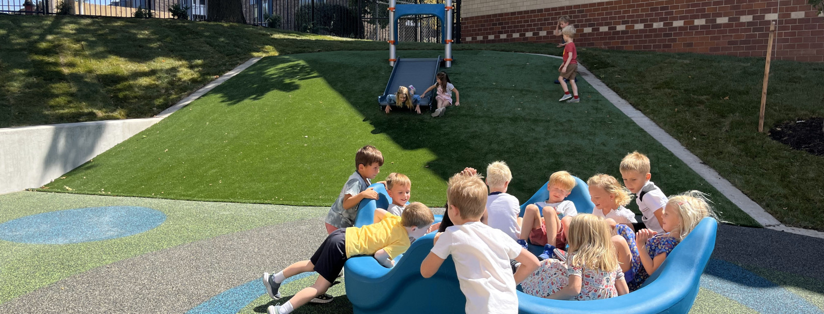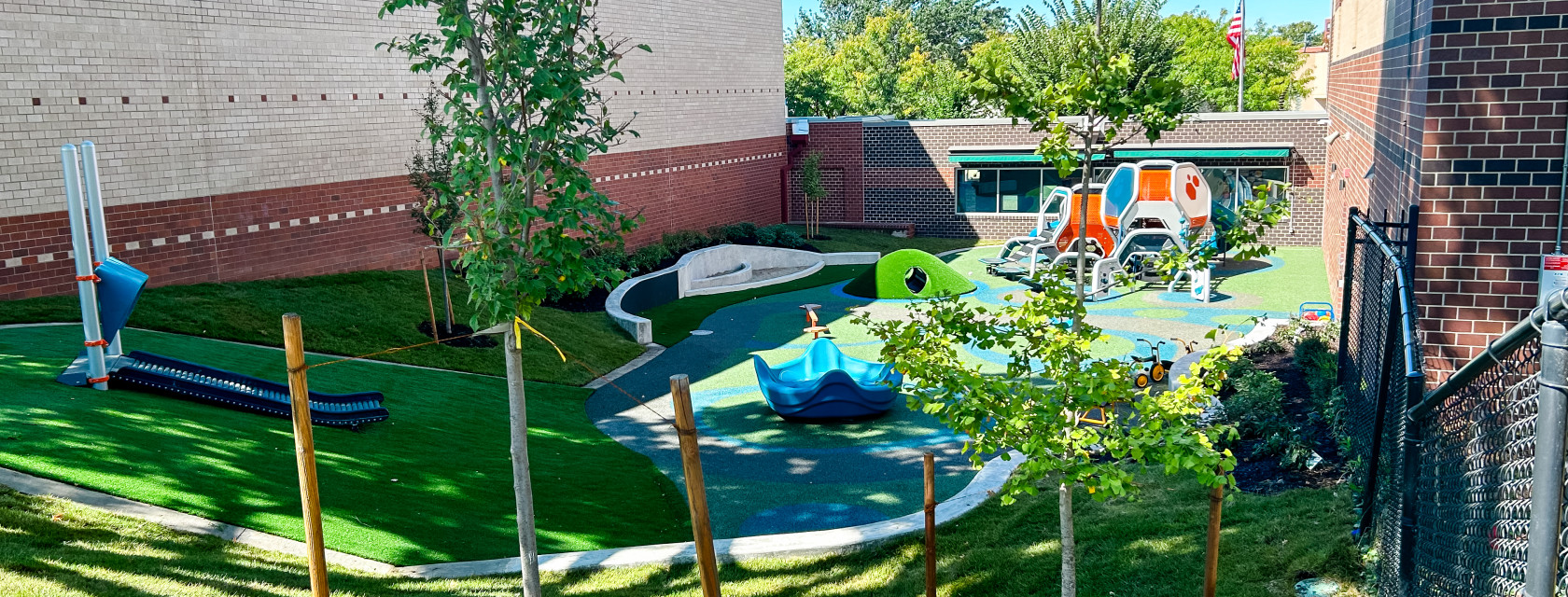Landworks Studio partnered with St. Paul’s Episcopal Day School to complete the final phase of their playground renovations, creating a dynamic new play space for the early childhood center. The narrow site was transformed into a colorful, nature-based environment that encourages exploration, learning, and imaginative play. Features include interactive play equipment, topography-integrated play mounds, a tot track, dramatic play zones, a custom chalk wall, and a sandbox.